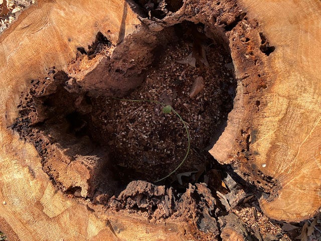 When all was said and done, we walked out to the stump. My oldest daughter was quick to point out that the empty rotten center was shaped kind of like a heart. I leaned in and noticed a vine growing in the middle. My eyes widened. A slow, sweet joy spread through my body aware of God’s presence at that very moment.